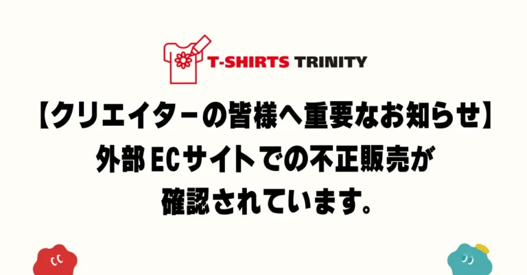 中国系ECサイト「TEMU」や国内外のマーケットプレイスにおいて、Tシャツトリニティにご登録いただいたクリエイター様のデザインと酷似した無断転載・販売事例が確認されています。