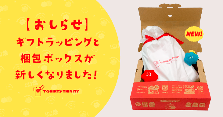 みなさんこんにちは!Tシャツトリニティです。 この度、ギフトラッピングサービスのギフトバッグ・配送用の梱包ボックスが新しくなりました! 新デザインの梱包ボックスをペタとポタが調べてみました!▼ まずは、宅配便(ゆうパック)用の梱包ボックスのデザインか […]